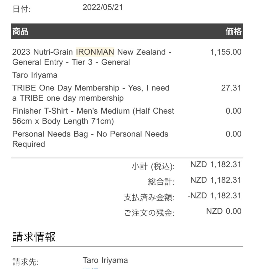 IRONMANではお馴染み、開催日を基準に5tierへ分け、エントリー日が早ければ早い程、お安くなる仕組み。因みに自分が申し込みしたのは2022年5月21日、その時点ではTier3 NZD1,155でした。