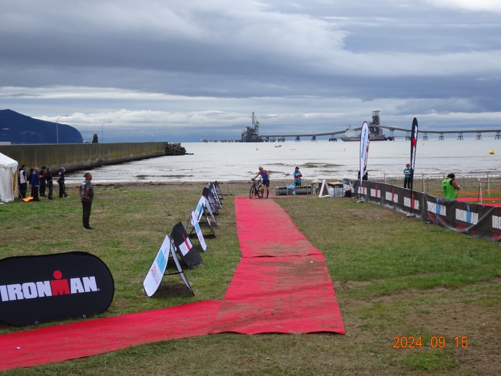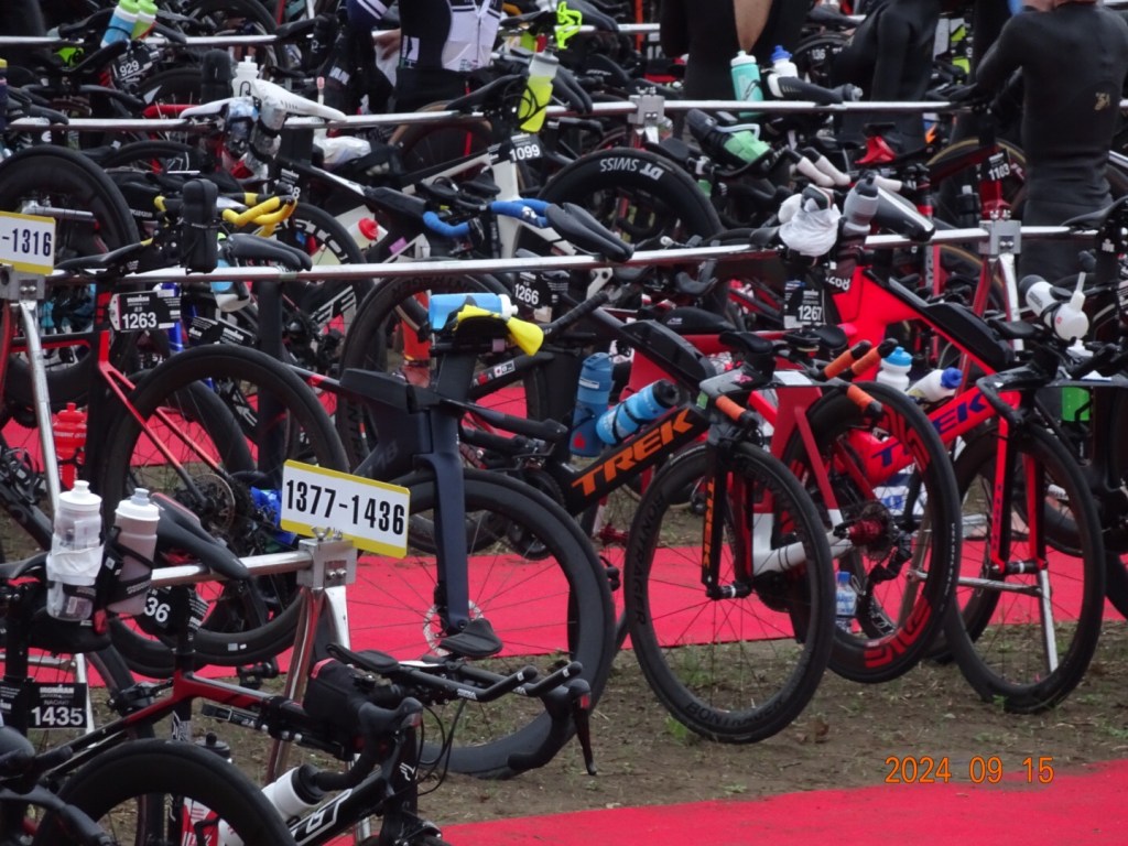 次は、ストリートギアバックとパーソナルニーズバッグを預ける。場所は、他の選手の動きを見つつ移動。預ける際、口を固く結ぼうとヒモを引っ張ると、ビリ…っと袋が裂けた。T1、T2に預けたバックも前日、ビリ…っと裂けた…汗 引っ張りすぎか…