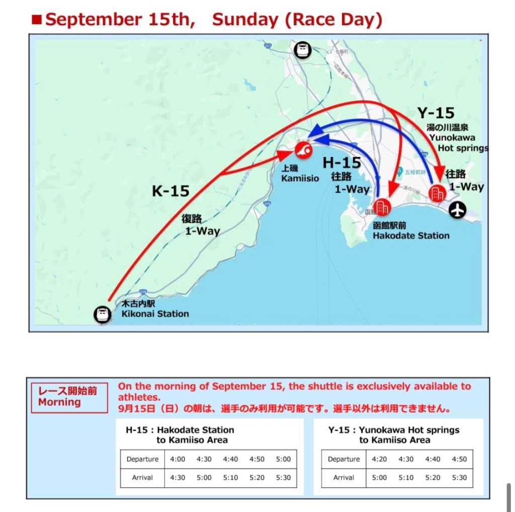 当日の移動方法。前日まで迷ったが、車で移動した。迷った理由は、大会シャトルバスに家族が同乗できないから。もともとシャトルバスの利用を前提としつつ、ホテルは函館駅前をチョイス。シャトルバスの拠点とされていたのがその理由で、このことは随分前からアナウンスされていた。しかし、7月頃に発表されたアナウンスでは、当日の朝だけは選手オンリーということ。これは想定外だった。