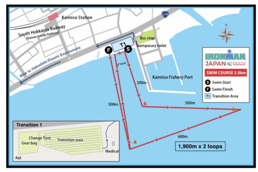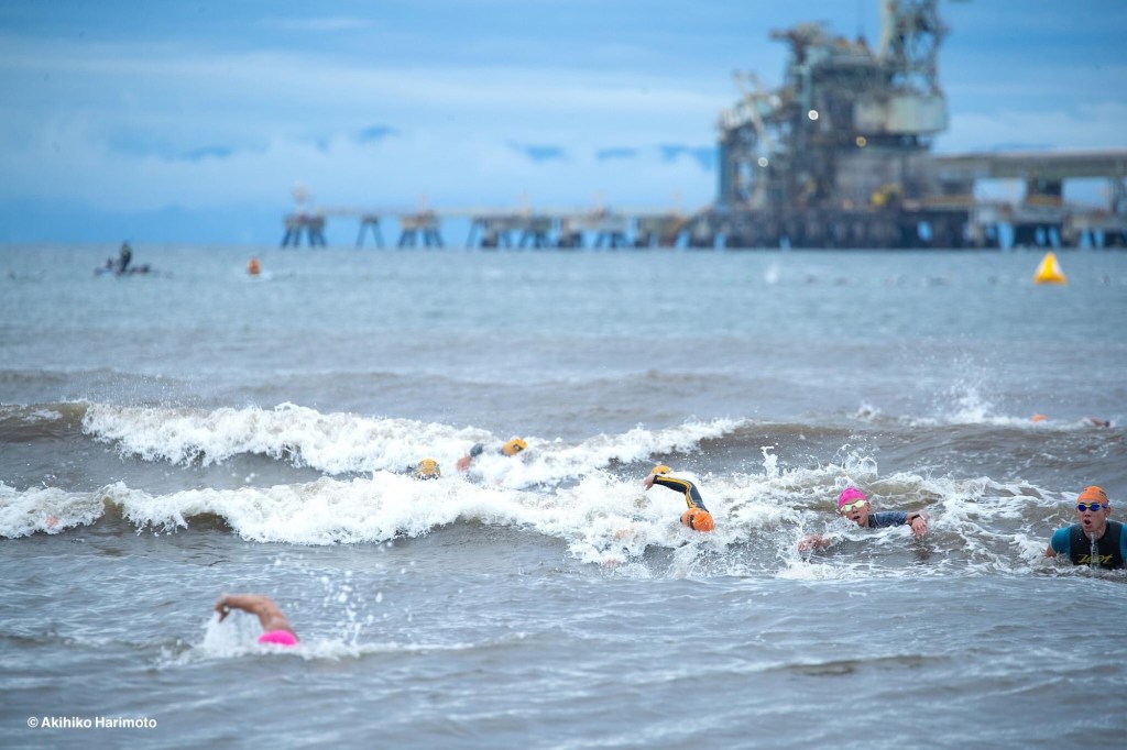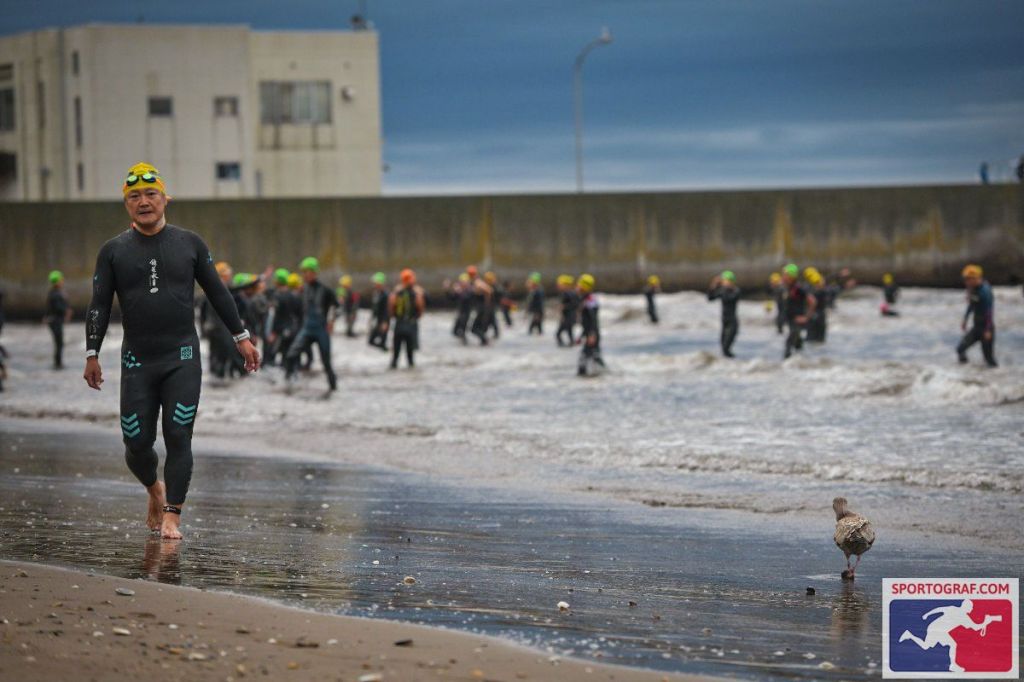 丁度着替え終わった頃、6時。15分間の試泳タイムが始まった。波は水際に押し寄せ、若干高い感じではあるが、昨年のフィリピンに比べると、全く問題なし。ココ北海道ではウェットスーツも着用しているしね。海へ入る。思いの外、遠浅だ。第1ブイ(恐らく200m)まで歩いて行ける。コーナーの目印となる赤いブイまでそれほど遠く感じず、そこまで行ってきたという、ルミナの謝さん曰く「赤いコーナーブイが風で立たなかったらしい。他のコーナーブイも同じだから、とても見にくい」確かに… コーナーブイは長さこそ2m超あるが、海上に横たわっているため、海面からの高さは50㎝もない。波で隠されるだろうと容易に想像がつく。