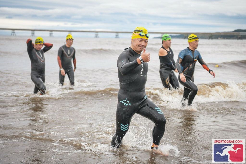そして…いよいよ6:30、号砲と共にローリングスタートが開始、次々と選手達が海へ、函館山へ向かって泳ぎ始めた。長い一日の始まりだ。