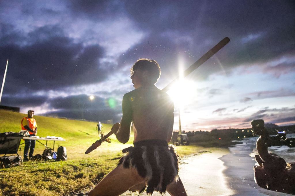 そんな前日の経験を活かし、両脚、両腕、おなか、背中へジェルを塗布。再び、スタート地点へ移動します。空は明るく開けてきました。そして、Hakaの時間(7:30)がやってきました。
