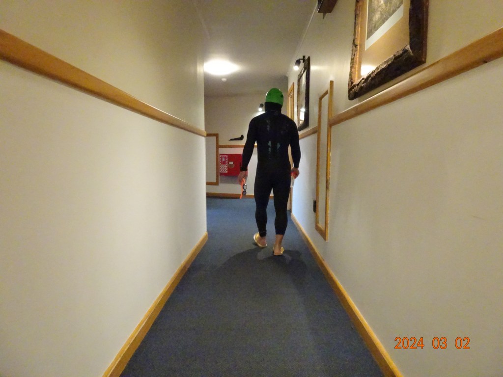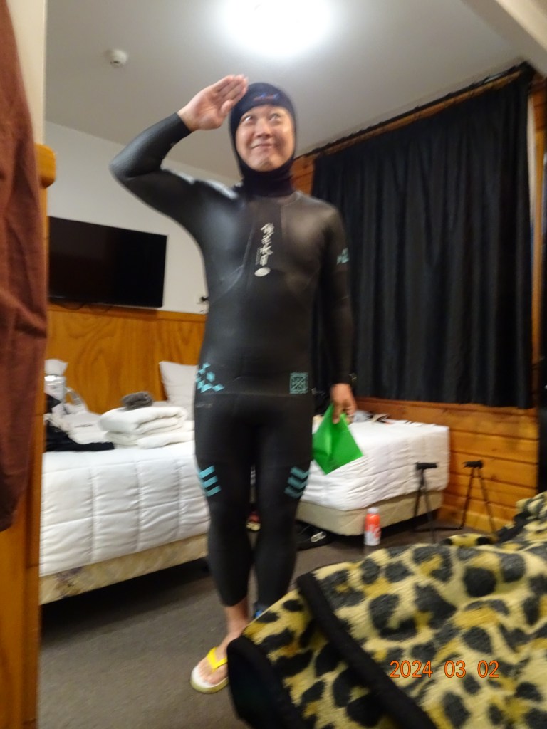 部屋で頭のウェットを装着。そして、ホットジェルを忘れずにヌリヌリ。このホットジェルが相当強力、いや強烈でした。前日の練習時に塗ってみたのですが、塗った直後、立っていられない程でした。マヂでやけどするのではないかと思わされるほど、強烈な刺激が両脚に襲い掛かりました。あとから考えると、塗布量に要注意でした。。。