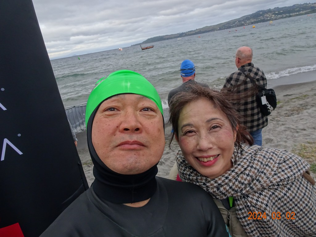 Hakaが終わるとスイムチェックの時間です。外国人選手からは「もう入っていいのか?」と聞かれ、お互い笑顔で湖に身を投じますw