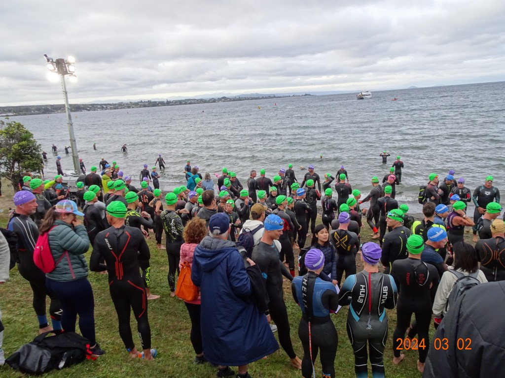 吐く息が白い。そんな指摘をてるみんにされる中、お約束のNZ名物「Haka」の雄叫びが湖から聞こえてきました。IMNZは70.3とFullが同日開催され、前者は後者より1時間早くスタートします。雄叫びの始まった時間は6時30分、アナウンスも観客も盛り上がってきました。