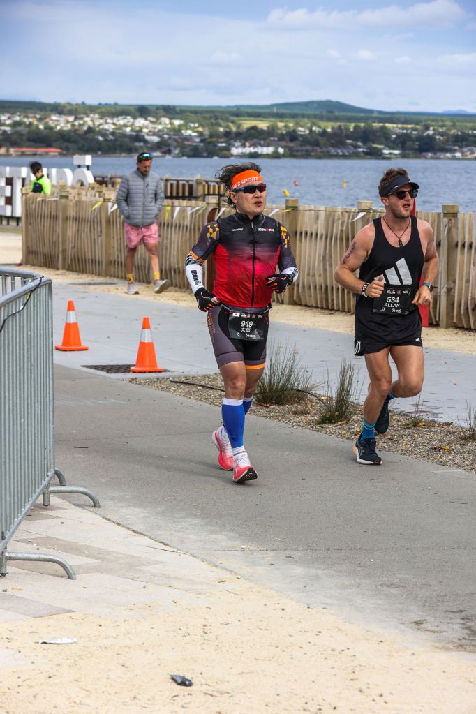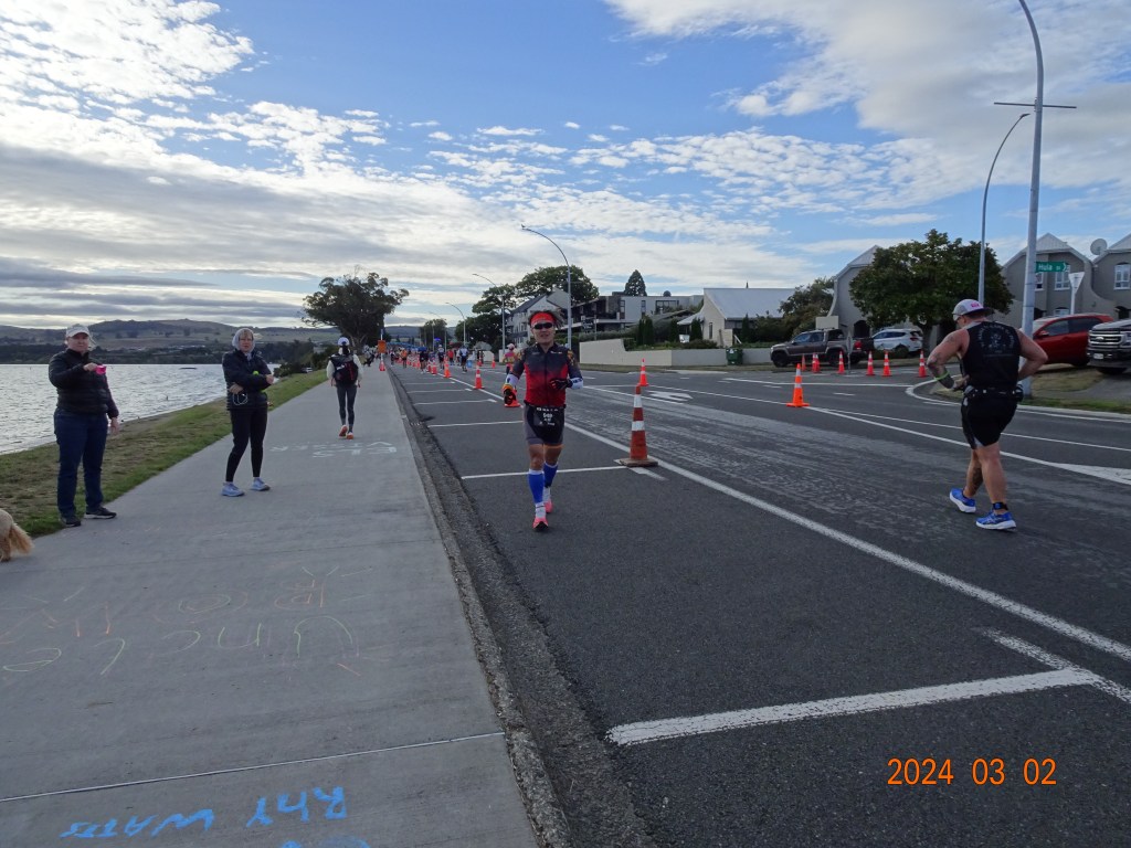 知人の息子は、大学のトライアスロン部に所属、卒業旅行として部員9人でIMNZへエントリー。その彼とは、ようやく2Lap目でお互いを認識、言葉を交わすことになった。彼のジャージに名前が入っていたため、わかりやすかった。若いだけあって流石に速い、、、