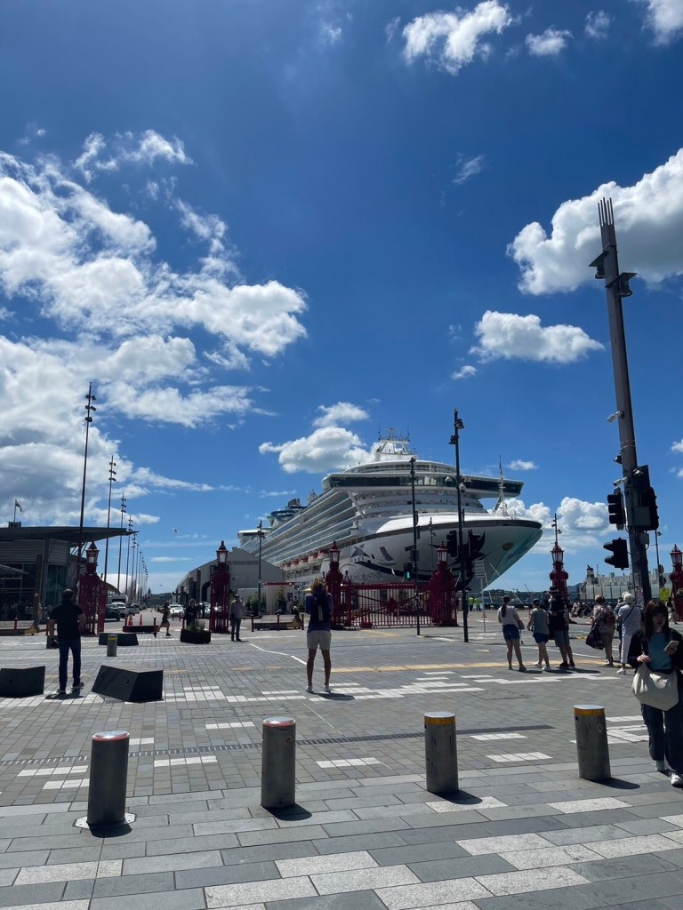 オークランド港には、ウォータースライダーを完備した大型客船が停泊中だった。