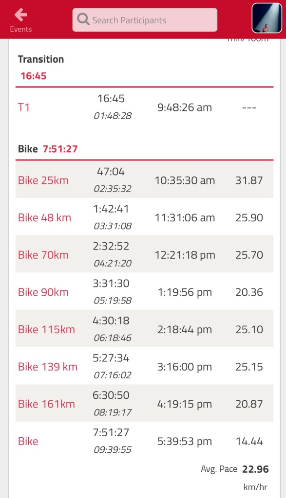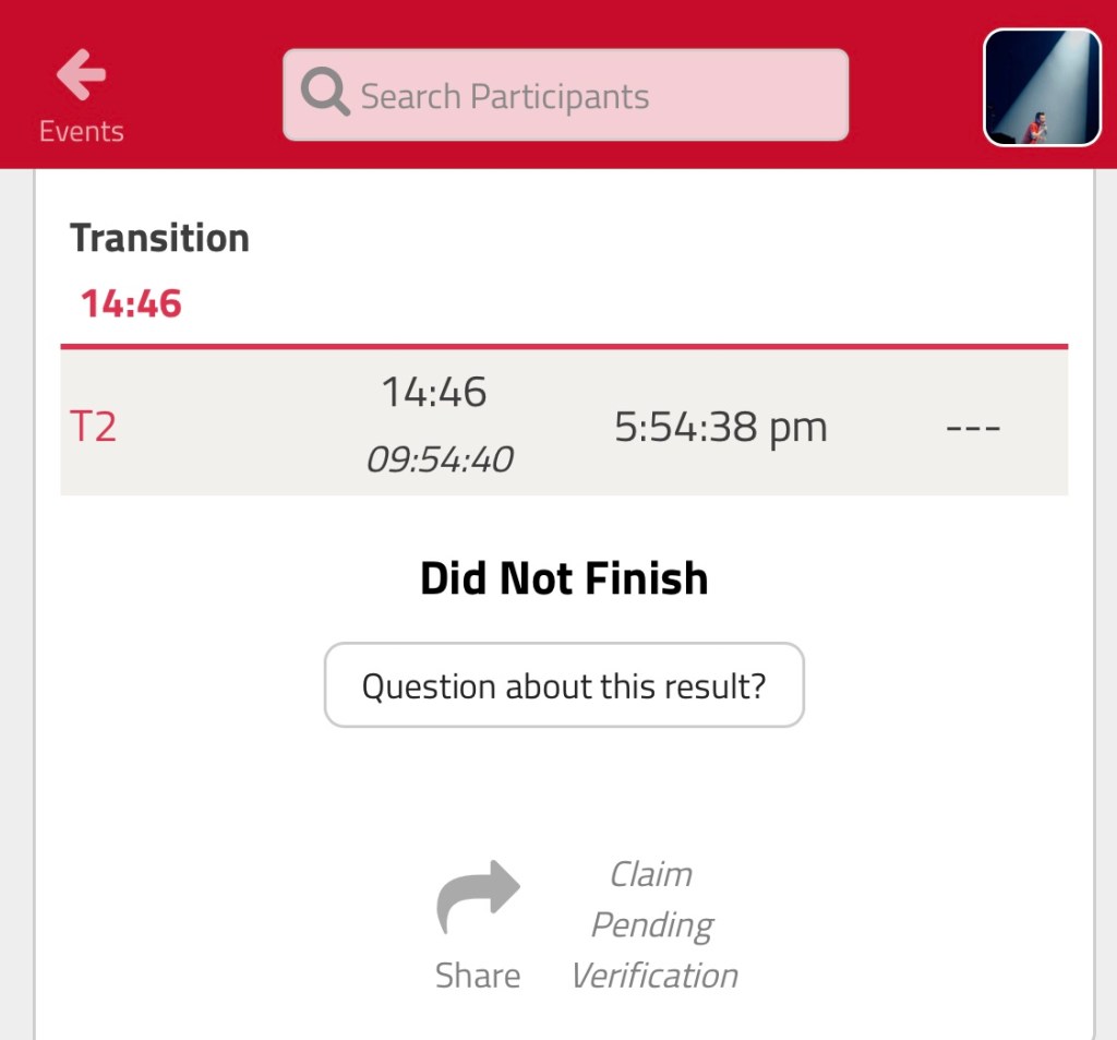 1Lapで終わろうと思ったが、何とかBIKEゴールへ入った。BIKEをボランティアへ渡しT2へ向かう。しかし、真っ直ぐ歩けない。身体中からアラートが発信されていることは明らかだった。